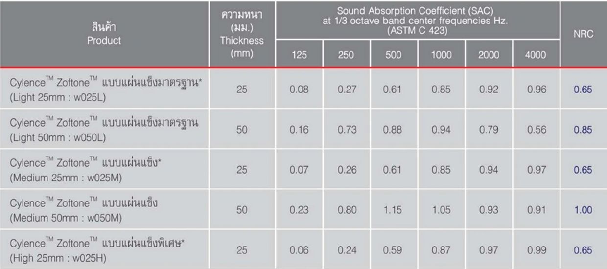 แผ่นอคูสติก Cylence Zoftone ผลิตจากใยแก้วความหนาแน่นสูง อัดเป็นแผ่นแข็ง พร้อมหุ้มผ้าใยแก้ว (Glass Cloth) ซึ่งมีคุณสมบัติไม่ติดไฟ
